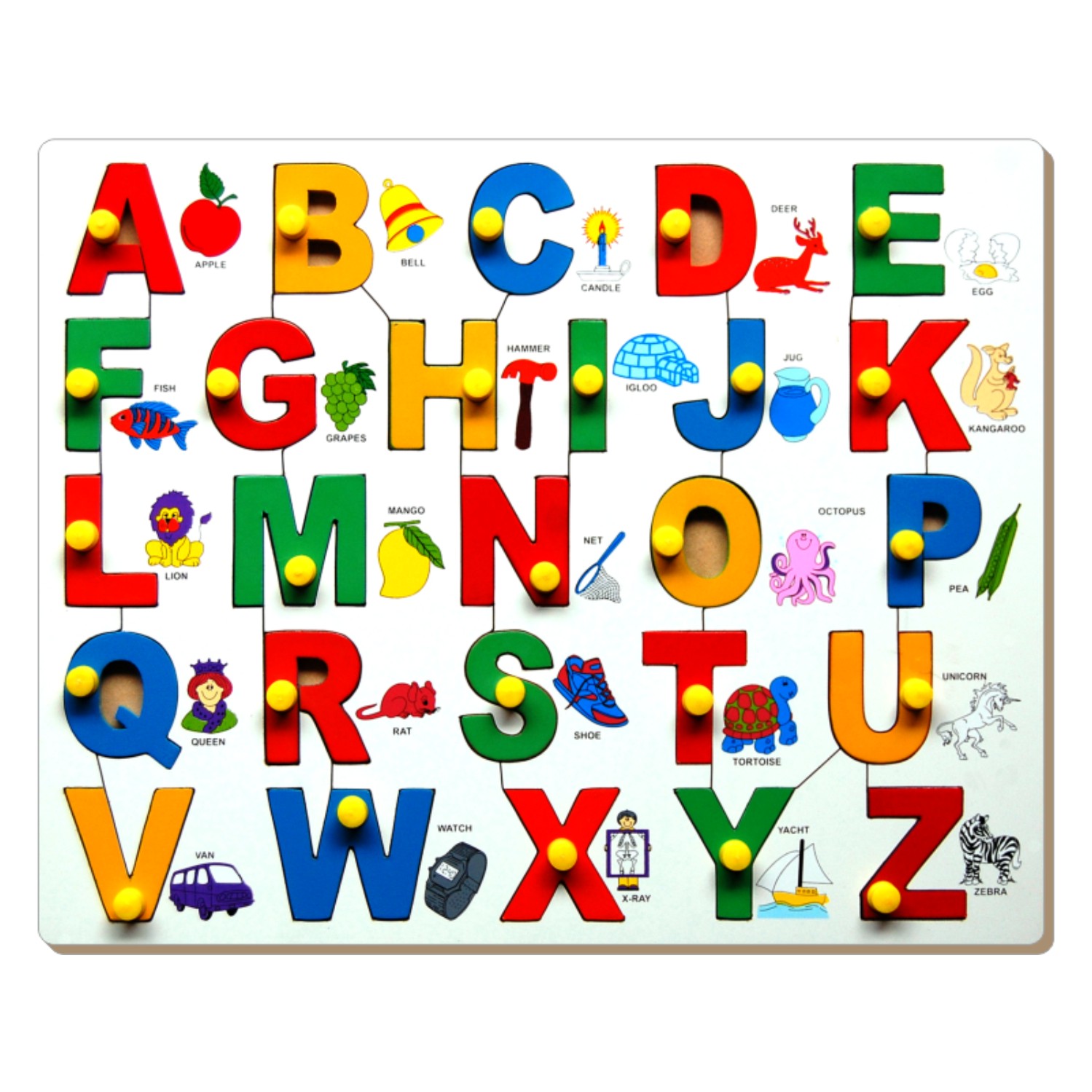 This big wooden puzzle is an easy introduction to English uppercase letters. Children learn through play as they fit the brightly colored wooden pieces in the board. The wooden alphabets make it easy for the little fingers to lift the pieces and learn the alphabets through play. Construction: Built-in tray for alphabets colourful pieces