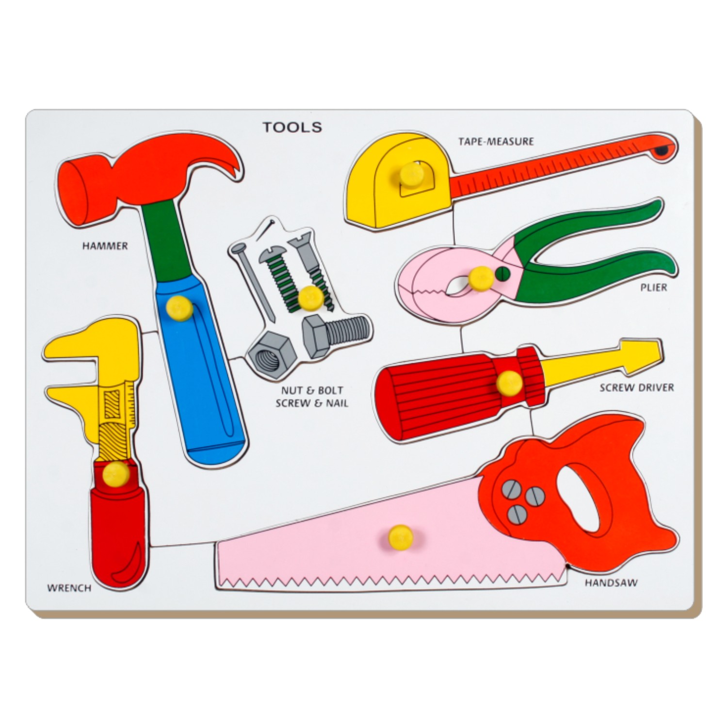 This tool tray with knobs is a fine puzzle which is designed to develop hand & eye coordination and the recognition of simple shapes while putting the knobbed pieces back in the cavities. Each knob has a grip that is made for the easy manipulation of the pieces. These knobs also make the puzzles ideal for children with impaired motor skills. The shapes may be used as stencils for tracing and the puzzle can be combined as a self-correcting classification exercise. The puzzle has a unique built-in tray which provides a stable base while the child is playing and also serves as a container preventing scattering and the loss of pieces when not in use. It is also made from MDF (Medium density fibre-board) by a special process. The pieces can be wiped or cleaned with a piece of moist cloth. Naughty fingers cannot peel or scratch the pieces.